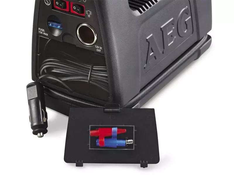 Mit der Luft- und Energiestation LA10 aus dem Hause AEG bringen Sie nicht nur den Luftdruck in Ihren Motorrad- und Autoreifen auf den richtigen Stand, sondern pumpen auch jegliche Arten von luftgefüllten Spiel-, Freizeit- und Sportartikeln wieder auf. Dazu sind im Lieferumfang drei verschiedene Düsen enthalten.
