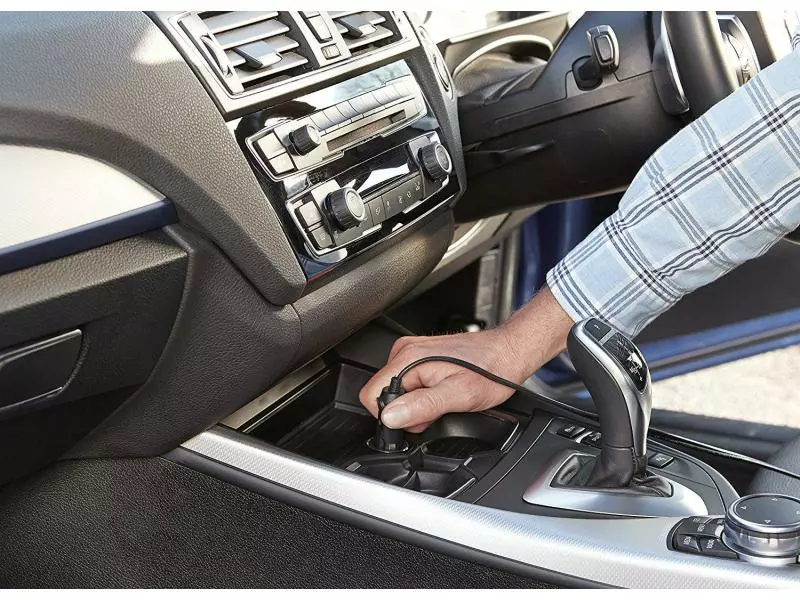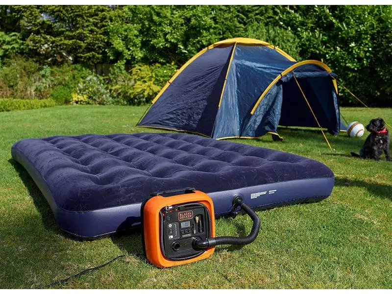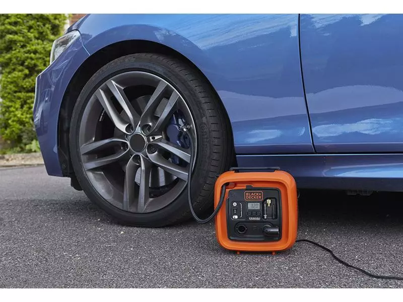 Der ASI400 von BLACK+DECKER ist ein kleiner Kompressor, der sich über die 12-V-Buchse am Fahrzeug betreiben lässt. Somit ist er ideal als Notfallpumpe für Autoreifen geeignet, aber auch als einfache Pumpe für Bälle oder Luftmatratzen. Die Schläuche und Ventile sind platzsparend im Gerät untergebracht.