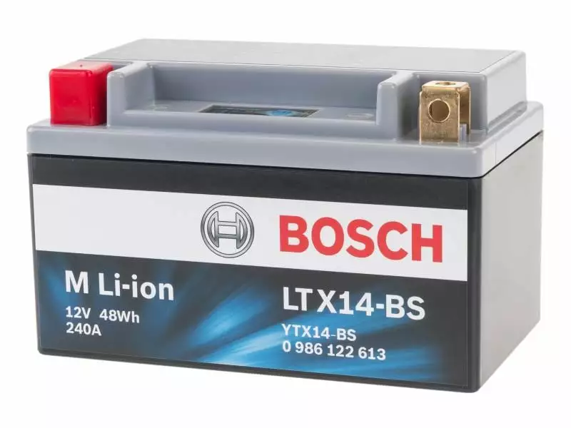 Nutzen Sie diese Lithium-Ionen-Batterie von Bosch Automotive, um Ihr Motorrad, Ihren Roller, ein Quad oder sogar einen Jetski mit einer neuen und kraftvollen Startbatterie auszurüsten. Dank innovativer Lithium-Ionen-Technologie hat sie nur ein Drittel des Gewichts einer vergleichbaren Blei-Säure-Batterie. Da bei motorisierten Zweirädern die Batterien meist sehr weit oben eingebaut werden, kann die besonders leichte Li-Ion-Batterie den Schwerpunkt der Maschine senken und damit das Fahrverhalten verbessern.