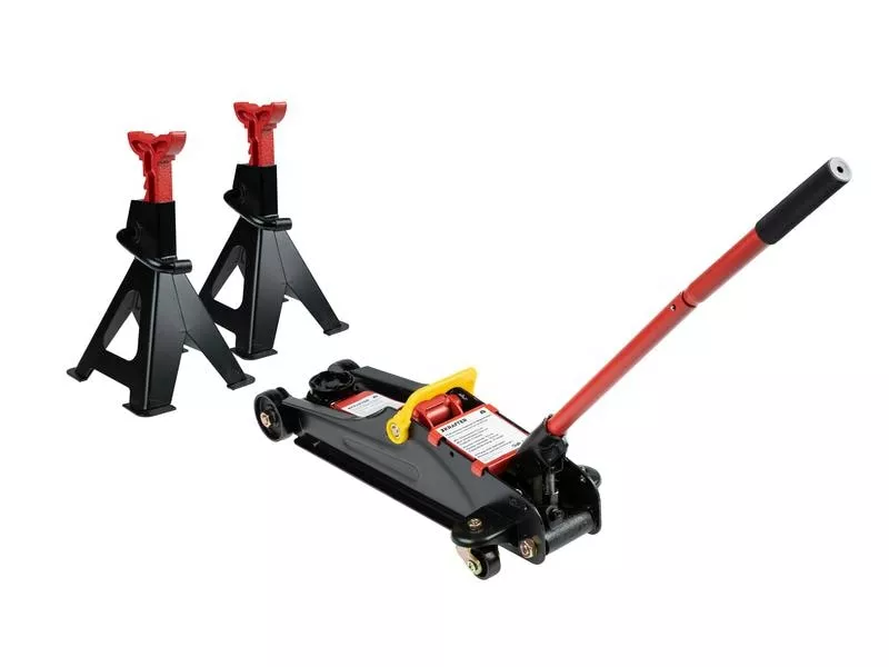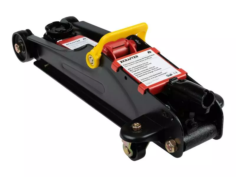 Mit diesem hydraulischen Wagenheber von Krafter können Sie nahezu mühelos Ihr Auto anheben und haben den Reifenwechsel im Griff. Er ist mit einem ergonomischen Transportgriff ausgestattet. Mit den zwei Lenk- und zwei Laufrollen ist die Handhabung des Wagenhabers leicht. Für tiefergelegte Fahrzeuge eignet er sich sehr gut. Zudem sind im Lieferumfang zwei praktische Unterstellblöcke enthalten, die jeweils eine Traglast von 2 Tonnen haben.