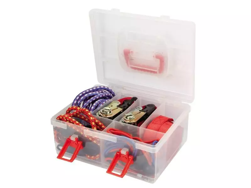 Dieses 18-teilige Set liefert alles, was Sie zum Befestigen und Festzurren brauchen. Neben zwei einzelnen Zurrgurten sind in der Box auch noch zwei mit Ratsche und Haken enthalten. Von den insgesamt 14 Gepäckspannbändern werden vier mit grossen Haken und zwei mit kleinen Haken geliefert. Zudem enthält das Set zwei Gepäckspannbänder mit Kunststoffhaken und sechs Gepäckspannbänder mit Kugel.