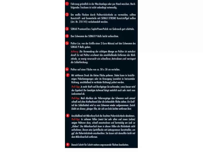 High-End Poliertechnologie auf Nano-Saphir-Basis für alle Lackarten und -zustände. Die Politur entfernt selbst feinste Verkratzungen vollständig, trägt verwitterte Lackschichten ab und frischt matte Farben maximal auf. Es entsteht ein perfektes Lackfinish und ein sehr gleichmässiger Tiefenglanz, der auch nach vielen Wäschen noch anhält, da der Lack optimal geglättet wurde. Die High-End Politur ermöglicht ein hologramm-, streifen- und wolkenfreies Ergebnis und eignet sich selbst zur Entfernung bereits bestehender Hologramme. Das enthaltene Carnauba-Wachs bietet zudem eine Grundkonservierung für die behandelten Lackoberflächen. Das Set beinhaltet die Politur, den speziellen SONAX P-Ball (Mat.-Nr. 104838) mit Schwamm sowie ein hochwertiges MicrofaserTuch.