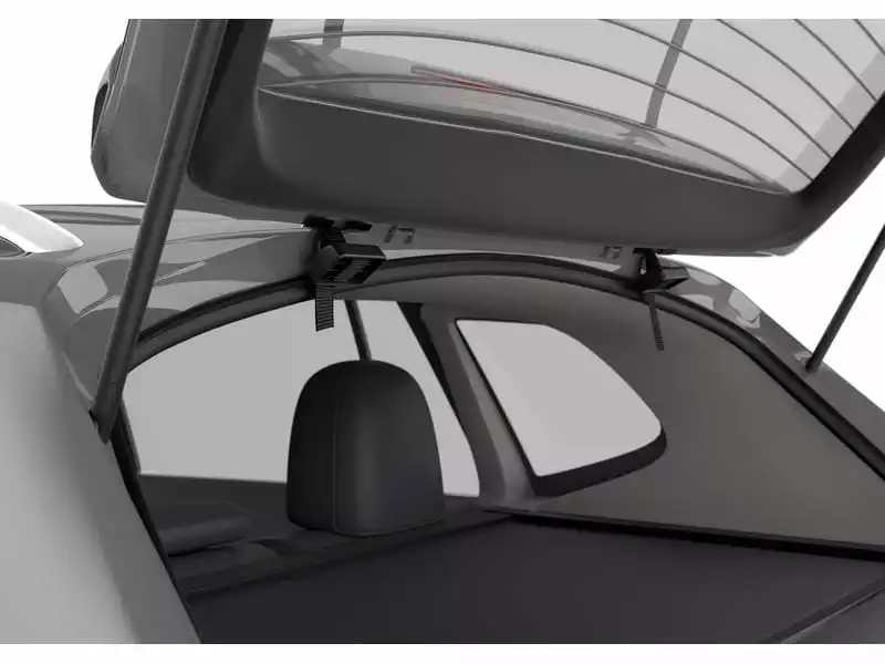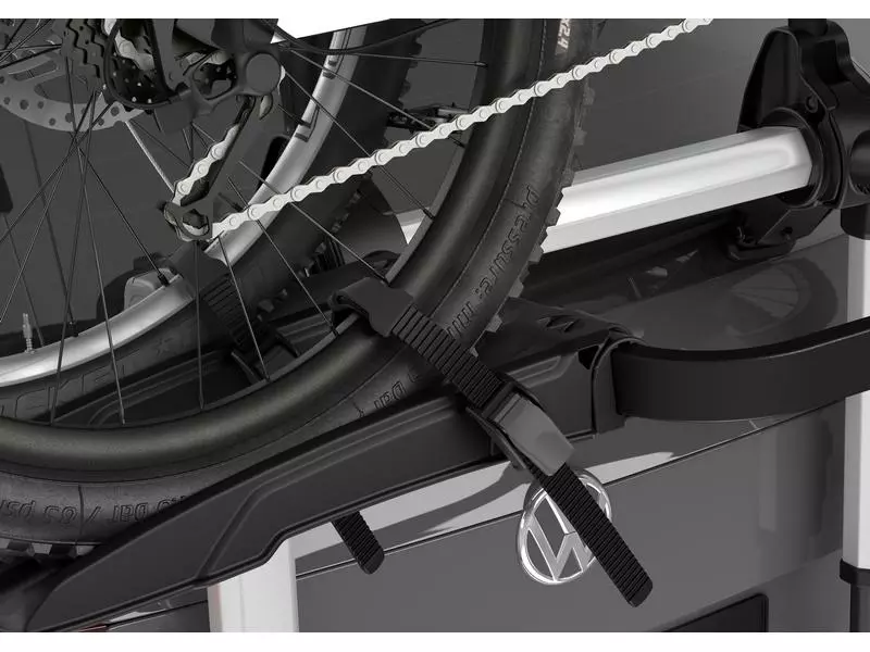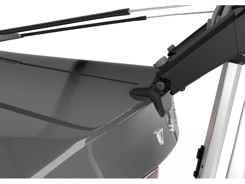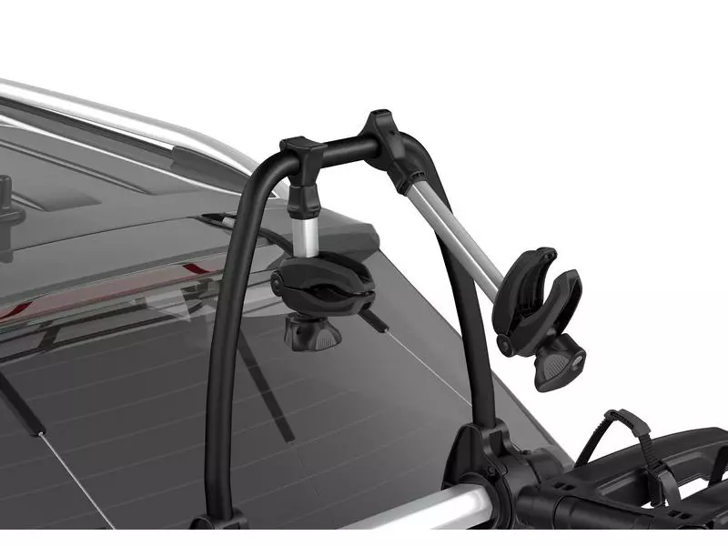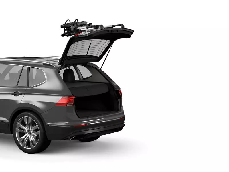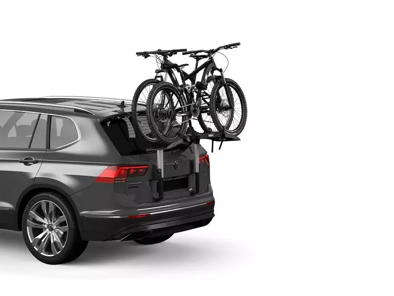 Thule Fahrradträger für unkomplizierte Ausflüge mit erhöhter Plattform, bei der die Rückleuchten und das Kennzeichen sichtbar bleiben.